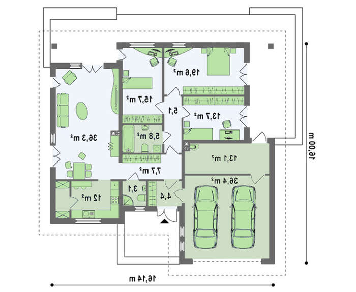 Много предметов, элементов декора и интерьера, сделанных из дерева или под дерево, имеется в доме 4М184. Это видно даже с улицы. Коричневые, а не традиционные белые, окна и двери красиво сочетаются со светлыми наружными стенами. В доме, на полу, лежит светлый ламинат, передающий текстуру древесины. В гостиной полки, стулья и стол создают легкую, приятную атмосферу. На кухне примостился маленький столик, у которого деревянная точеная ножка отлично сочетается со столешницей из стекла. Оценят хозяйки и нетрадиционное месторасположение окошка. Оно умостилось прямо перед рабочей зоной, так, что можно мыть посуду и любоваться пейзажами за окном.