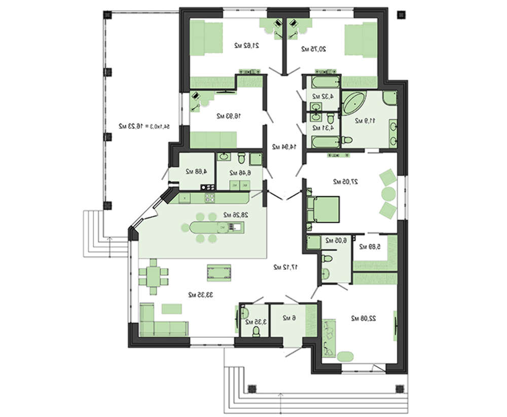 Проект содержит три раздела – Архитектурный, Конструктивный и Инженерный: водоснабжение, отопление, вентиляция, канализация, электроснабжение (приобретается за дополнительную плату) + Пояснительная записка.