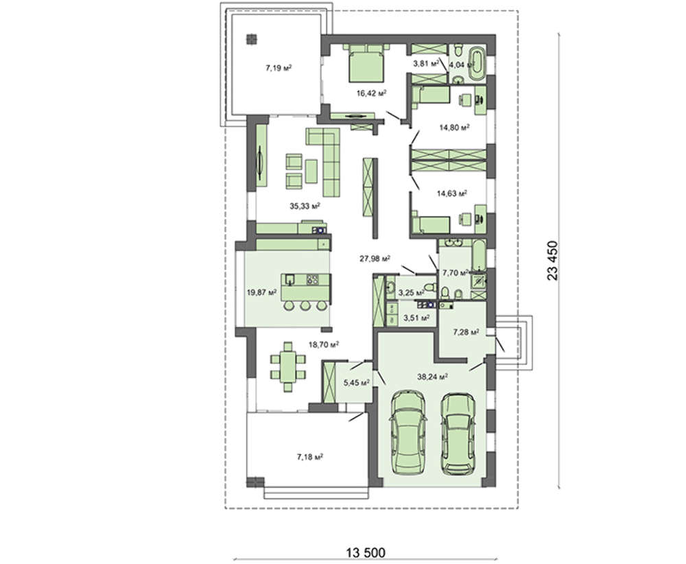 Проект содержит три раздела – Архитектурный, Конструктивный и Инженерный: водоснабжение, отопление, вентиляция, канализация, электроснабжение (приобретается за дополнительную плату) + Пояснительная записка.