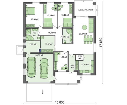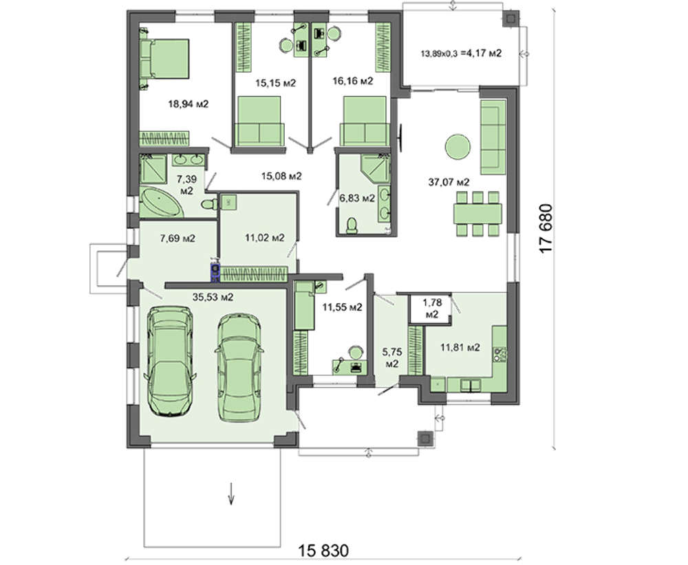 Проект симпатичного европейского дома площадью 205 кв. м с гаражом на два авто 4M569