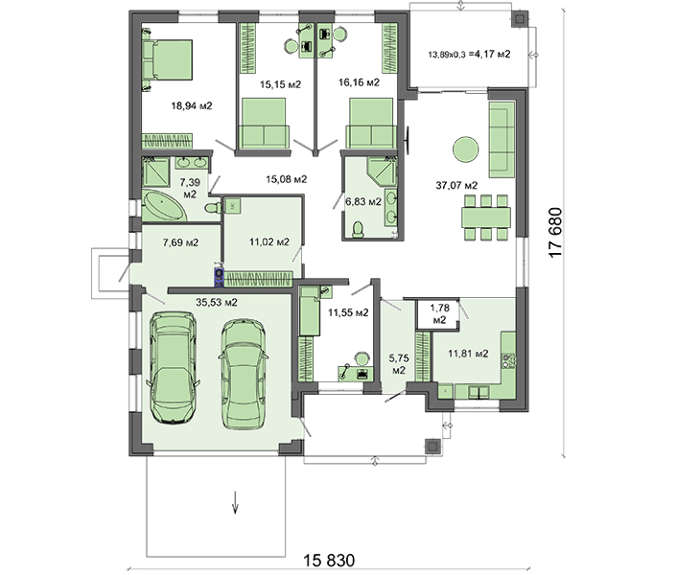 • 4M569 Проект симпатичного европейского дома площадью 205 кв. м с гаражом на два авто