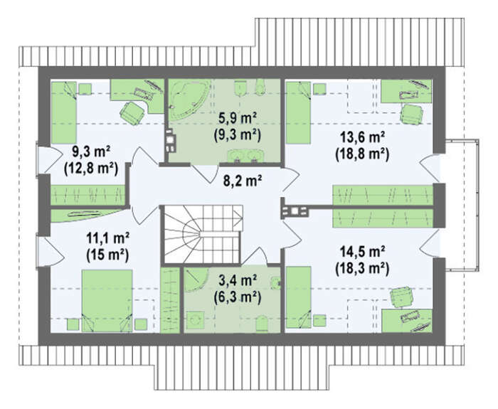 Второй этаж остался практически в том же виде. Единственное изменение заключается в том, что самая большая спальня лишилась собственной гардеробной. Зато размеры санузла с душевой кабиной увеличились настолько, что появилась возможность разместить здесь прачечную.