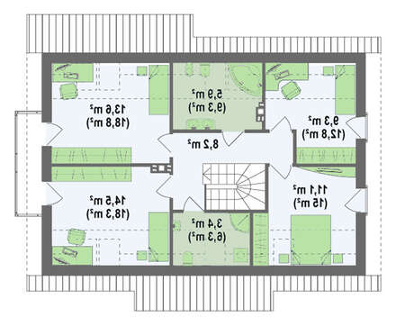 Второй этаж остался практически в том же виде. Единственное изменение заключается в том, что самая большая спальня лишилась собственной гардеробной. Зато размеры санузла с душевой кабиной увеличились настолько, что появилась возможность разместить здесь прачечную.