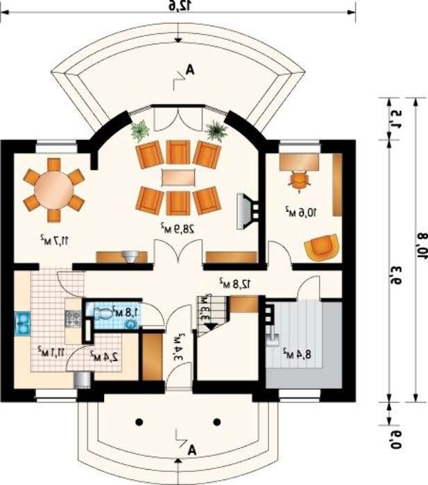 При разделении первого этажа на зоны в пространство нижнего уровня включены комнаты разного функционального назначения. После слияния гостиной и столовой получено значительное по габаритам помещение, размеры которого рассчитаны на проведение молодежных вечеринок и больших банкетов. Выход прямо на загородное приволье позволяет часть праздника переносить на приусадебный участок. Среди красивой растительности и в тени деревьев гулянья становятся особенно интересными и запоминающимися. Уникальность кухни в наличие дополнительной площади, которая может быть использована для размещения бытовой техники и хранения съестных припасов.