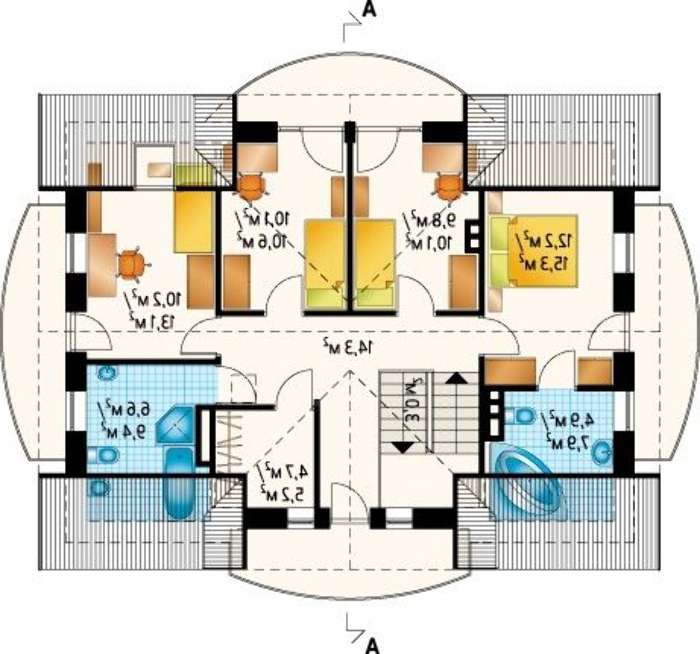 Здание рассчитано на проживание большой семьи, для этого предусмотрено пять индивидуальных помещений. Комната на первом этаже представляет интерес для старшего поколения. Четыре спальни второго уровня отличаются планировкой и уровнем благоустройства. Особыми привилегиями наделены апартаменты хозяина. Здесь помимо просторного балкона есть собственный санузел, наличие которого позволяет принимать водные процедуры и отдыхать от забот трудового дня.
