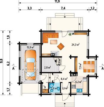Натуральный характер примененных архитектурных элементов не мешает строению быть комфортным с высоким уровнем благоустройства. Автолюбители славно оценят гараж, включенный в простор первого этажа, подобный проект дает возможность выполнять работы в удобных условиях. Дом рассчитан на проживание большой и согласованной семьи. Практически все пространство первого этажа отдано на приятельские встречи. Соединенные в одно помещение кухня, столовая и гостиная позволяют проворно и качественно сервировать столы для торжественных обедов. Отдельный выход на террасу, предусмотренный из гостиной, позволяет без труда перемещаться между внутренним и наружным пространствам и беспрепятственно наслаждаться такими прелестями частного строения, как загородный простор, свободы и беспрестанно свежий воздух.