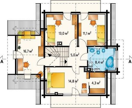 Для личного времени и отдыха потребуются спальные помещения, в проекте деревянного дома их предусмотрено четыре. Имея в своём распоряжении выходы на балконное пространство позволительно в любое время наслаждаться картинами раздольной растительности. Два помещения выполнены уединенно, оборудованы личными балконами и отмечены большими площадями. Одно из них за счет обширной гардеробной комнаты будет особенно интересно почитателям моды и любителям красивой одежды.