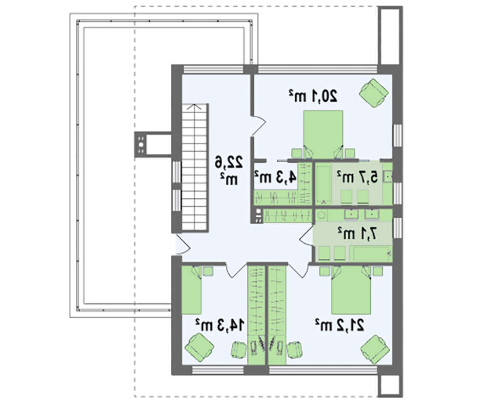 Невысокое, всего в две ступеньки, крыльцо расположилось рядом с гаражом. Войти в дом можно как через центральный вход, так и через гараж, что очень удобно, особенно в плохую погоду. В этом доме каждый найдет себе занятие по интересам. Здесь есть домашний кинотеатр, который разместился в гостиной, столовая с большим столом, спортзал, кстати, тоже с выходом на улицу. Кухня отделяется от зоны столовой длинным столом. Еще на первом этаже есть небольшая душевая. Полноценная ванная комната есть на втором этаже, и даже не одна, а целых две. Там же расположились три спальни. Над гаражом есть чудесная терраса. Наполовину она закрыта навесом – продолжением крыши