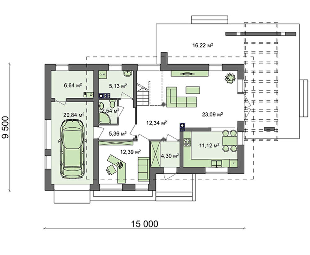 Проект содержит три раздела – АрхитектурныйКонструктивный и Инженерный: водоснабжение, отопление, вентиляция, канализация, электроснабжение (приобретается за дополнительную плату) + Пояснительная записка.