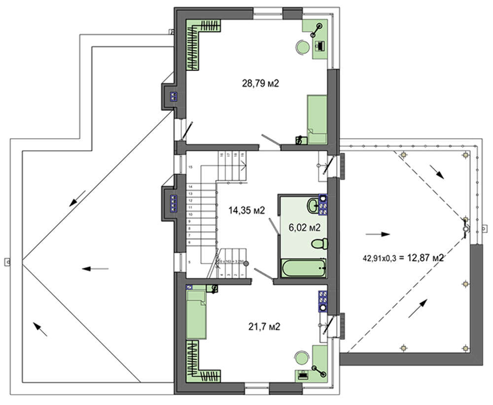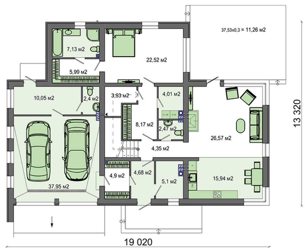 Проект содержит три раздела – Архитектурный, Конструктивный и Инженерный: водоснабжение, отопление, вентиляция, канализация, электроснабжение (приобретается за дополнительную плату) + Пояснительная записка.