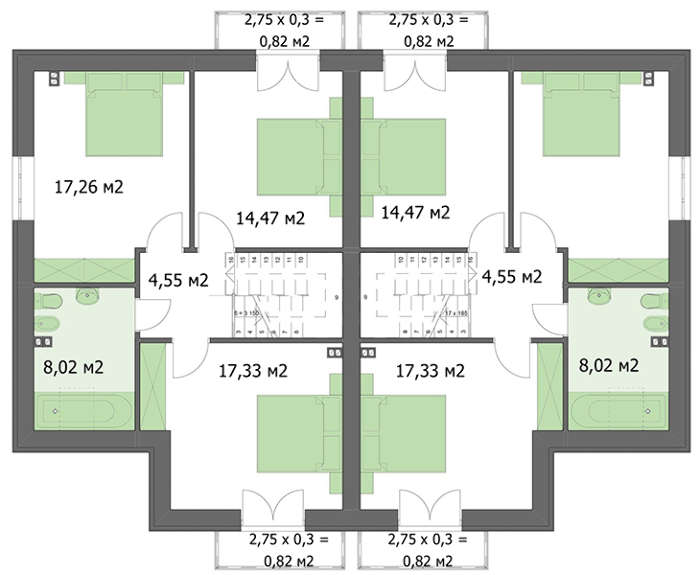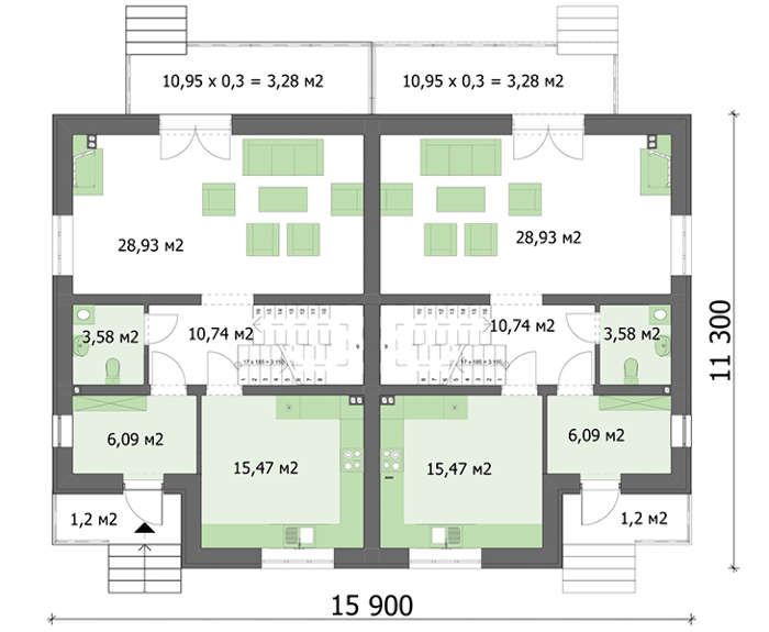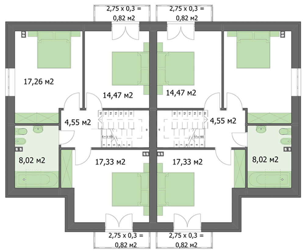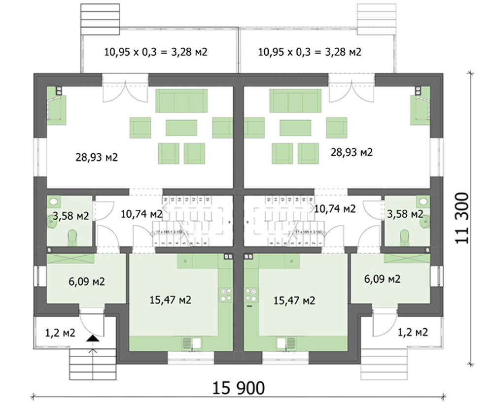 Проект содержит три раздела – Архитектурный, Конструктивный и Инженерный: водоснабжение, отопление, вентиляция, канализация, электроснабжение (приобретается за дополнительную плату) + Пояснительная записка.