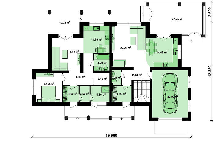 Проект содержит три раздела – Архитектурный, Конструктивный и Инженерный: водоснабжение, отопление, вентиляция, канализация, электроснабжение (приобретается за дополнительную плату) + Пояснительная записка.