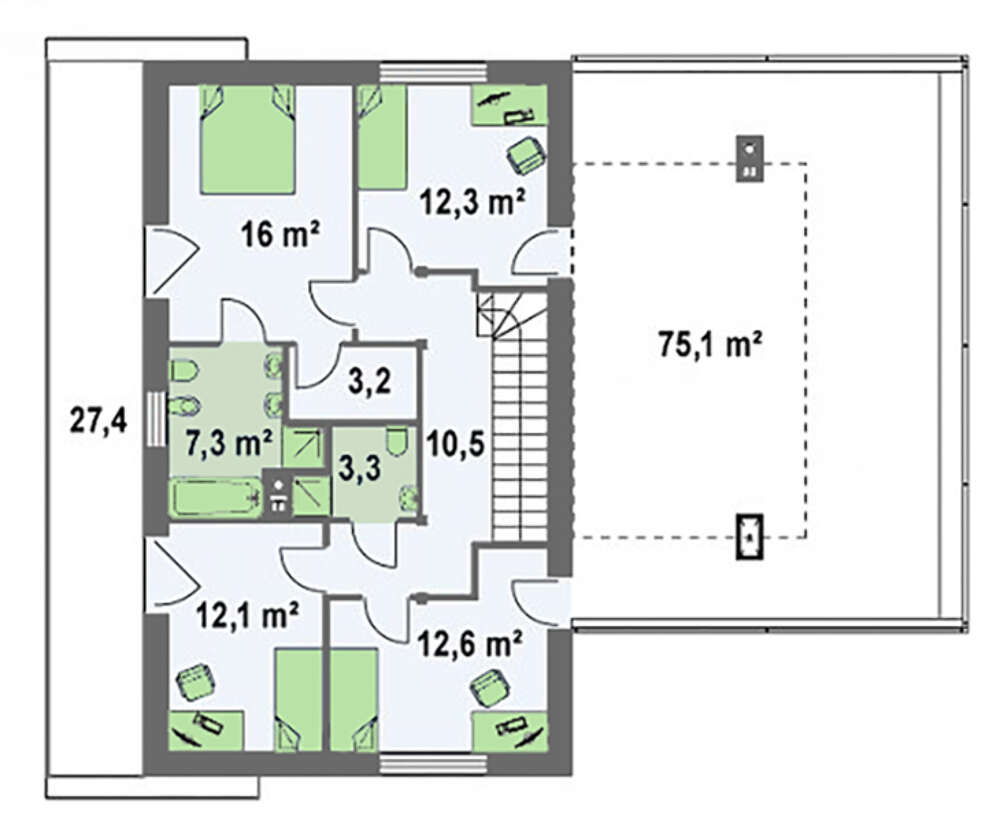 Дом 4M638 учитывает потребности и увлечения позитивно настроенных людей, которым скучно бездействовать. Он создан для тех, у кого ни один день не проходит без приключений, кто любит солнце и свежий воздух. Большой гараж с выходом в дом позволяет оставаться в движении в любую погоду. Просторная терраса над гаражом – это рациональное использование крыши. В доме много комнат, но каждая из них имеет свое функциональное предназначение. Простота и практичность современной архитектуры, в сочетании со светлыми красками и большим количеством белого цвета, создают ощущение абсолютного позитива.