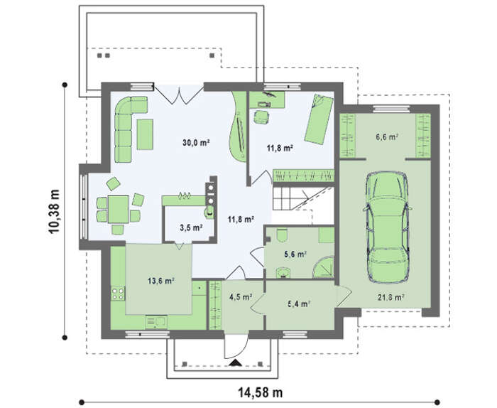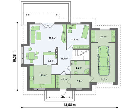 Дом с мансардой над гаражом понравится тем, кто ценит добротность и уют. Тщательно продуманная планировка внутреннего пространства позволяет комфортно разместиться большой дружной семье.
