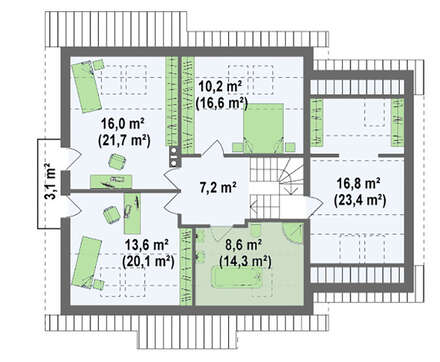 На втором этаже находятся три спальни и просторная ванная комната. А в мансарде над гаражом можно обустроить спортзал, кабинет или комнату отдыха. А если семья разрослась, то из этого помещения выйдет еще одна спальня.
