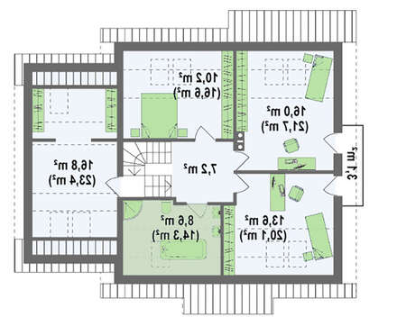 На втором этаже находятся три спальни и просторная ванная комната. А в мансарде над гаражом можно обустроить спортзал, кабинет или комнату отдыха. А если семья разрослась, то из этого помещения выйдет еще одна спальня.