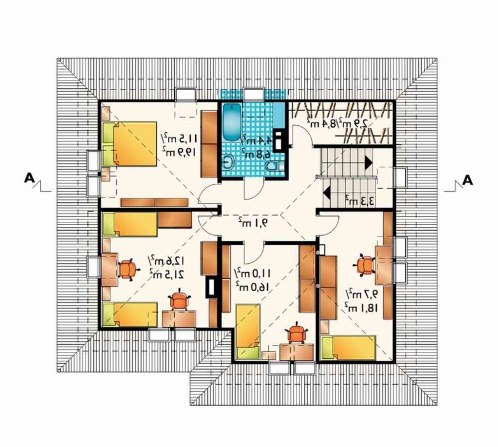 Четверо спальных апартаментов верхнего этажа предназначены для проживания членов семьи. Комнаты компактные, по размерам достаточные для размещения требуемой для приватной жизни мебели. Невеликая разность в площади и планировке ставит обитателей строения в практически одинаковые условия.