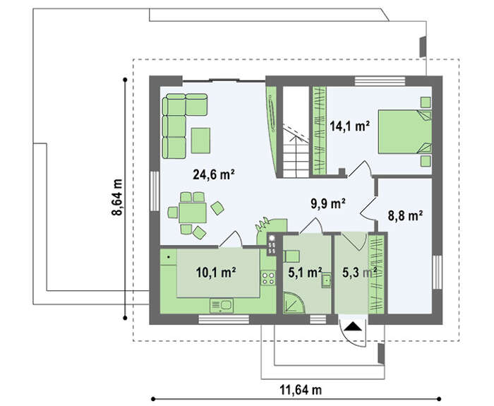 Проект содержит три раздела – АрхитектурныйКонструктивный и Инженерный: водоснабжение, отопление, вентиляция, канализация, электроснабжение (приобретается за дополнительную плату) + Пояснительная записка.