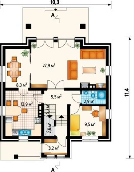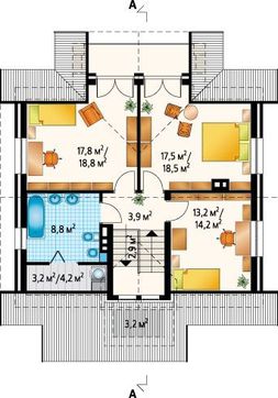 Раскрасить свою жизнь в яркие цвета и наполнить ее солнцем поможет интересный особняк площадью более 150 квадратов. Жизнерадостную атмосферу будут поддерживать окрашенные в светлые тона стены, которые рядом с алою яркою крышею оживают и наполняются сиянием. Кирпичная кладка по низу строения как завершающий штрих превращает особняк в маленькое небесное светило, что будет освещать вашу жизнь.