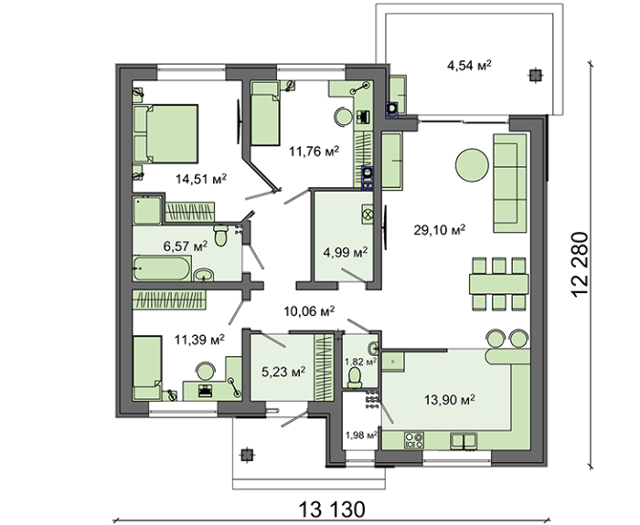 • 4M414 Проект загородного коттеджа с тремя спальнями и двускатной крышей