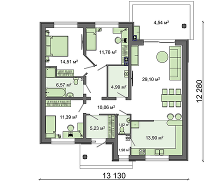 Проект загородного коттеджа с тремя спальнями и двускатной крышей