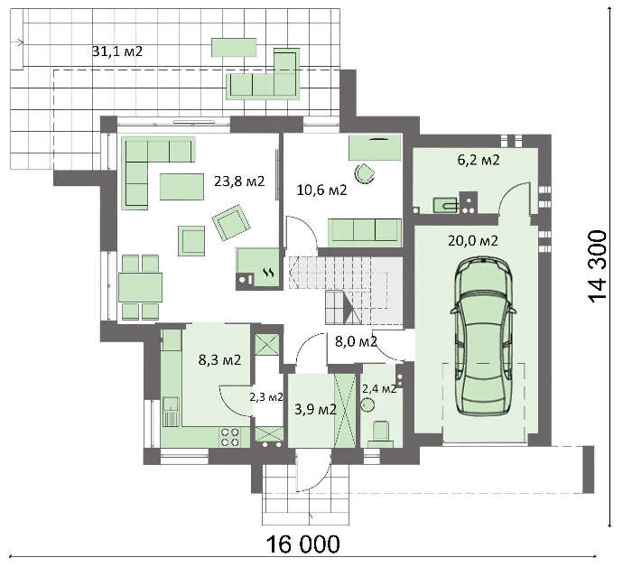 Проект содержит три раздела – Архитектурный, Конструктивный и Инженерный: водоснабжение, отопление, вентиляция, канализация, электроснабжение (приобретается за дополнительную плату) + Пояснительная записка.