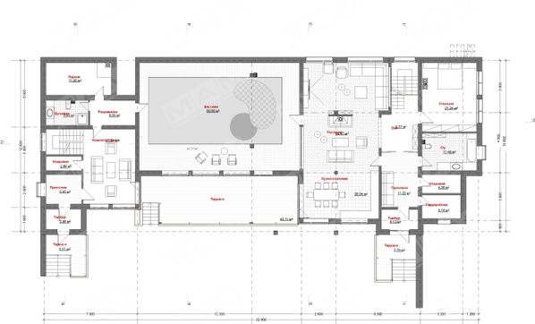 Проект жилого коттеджа с удобной планировкой и бассейном внутри 4M1884