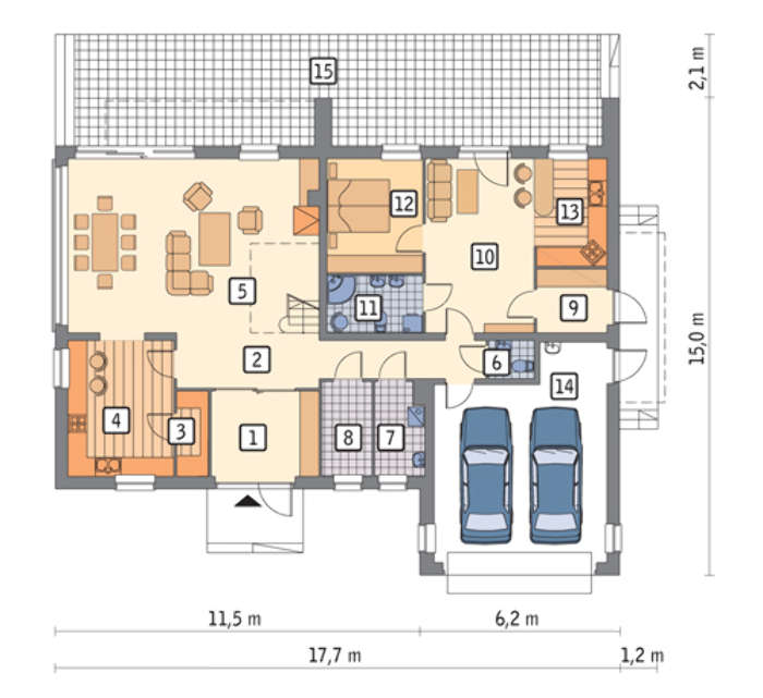 Проект содержит три раздела – Архитектурный, Конструктивный и Инженерный: водоснабжение, отопление, вентиляция, канализация, электроснабжение (приобретается за дополнительную плату) + Пояснительная записка.
