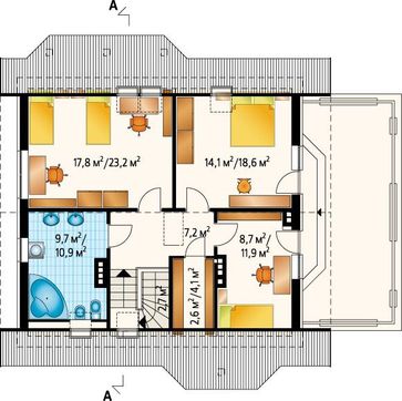 Чтобы полноценно отдохнуть имеется четыре спальных покоя. Один из них перенесен на первый этаж, такое расположение удобно для старшего поколения семьи.