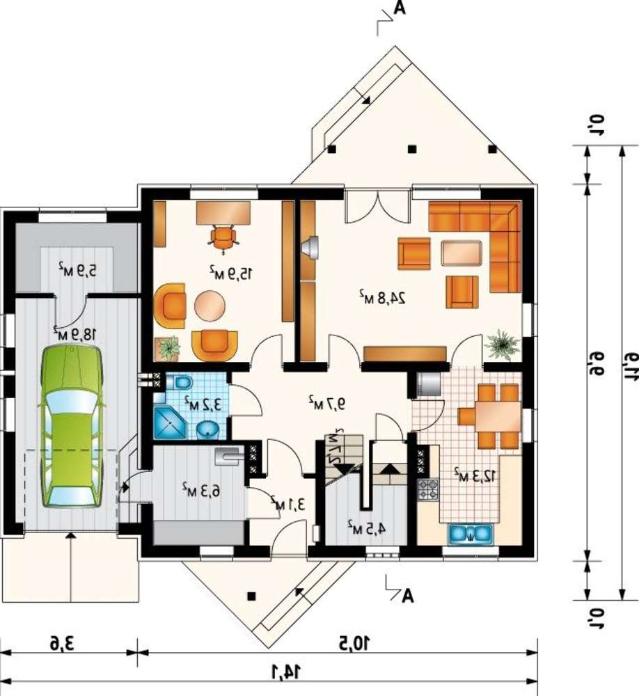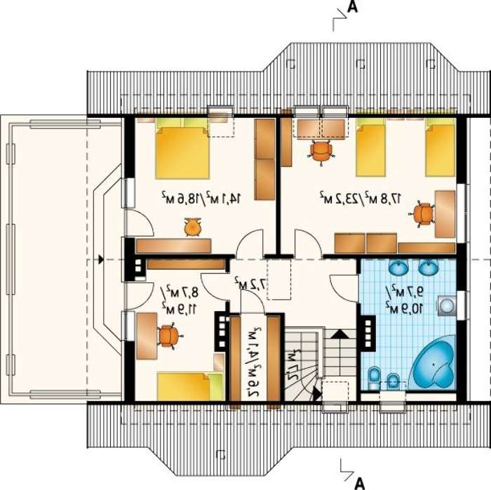 Внутреннее пространство позволяет обитателям вести дружную жизнь, в которой больше всего ценится свобода. Помещения отделены друг от друга в уединенные покои, в жилье не поддерживается совмещение пространств для увеличения их размеров. Тут же под крышею определено место для гаража и выделено комната любителю машинных дел под автомастерскую.