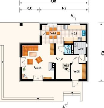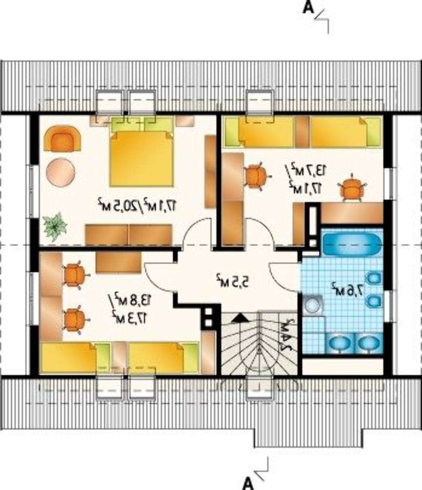 Стильный и компактный жилой дом идеально впишется в простор любого участка на приволье. Для его небольших размеров найдется место даже на крохотной дачной территории. Такая компактность нисколько не отразилась на внутренней планировке. Под красивою коричневого цвета крышею прячутся три спальни большого размера. Их приближенные к квадрату формы позволяют роскошно поместить полноценные спальные гарнитуры.