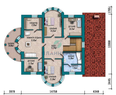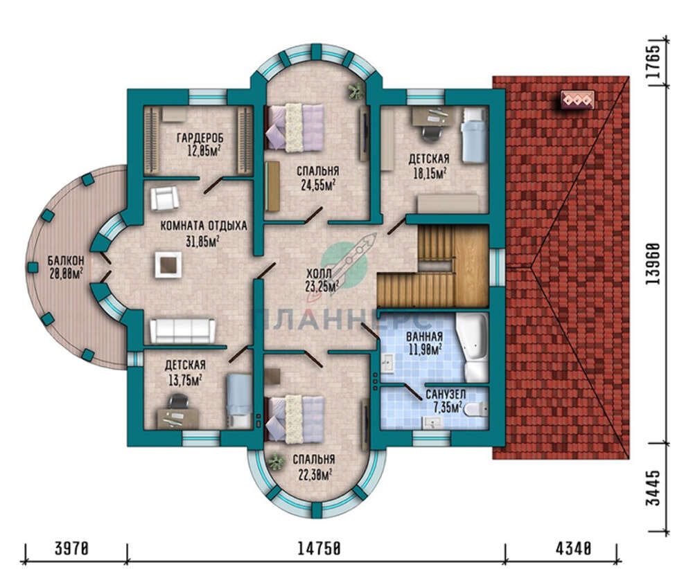 • 4M1414 Схема просторного особняка площадью 430 кв. м с круглым балконом и пристроенным гаражом