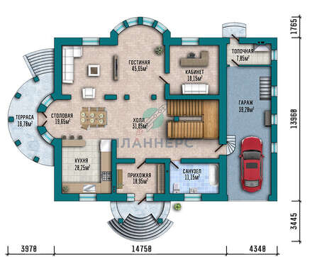 Схема просторного особняка площадью 430 кв. м с круглым балконом и пристроенным гаражом 4M1414