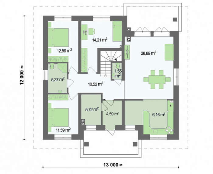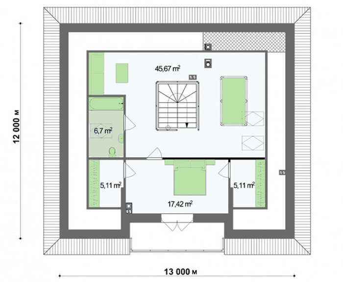 Общая гостиная второго уровня имеет большие размеры и может быть использована для тренажерного зала, бильярдного помещения, светских встреч. Спальному пространству верхнего этажа уделено много места и внимания. Оно не похоже на другие простором, включает в себя два вспомогательных помещения, которые благоприятно применять под гардеробные. Прекрасный балкон позволяет много времени проводить на свежем воздухе, получать наслаждение от утренней прохлады и любоваться вольными просторами собственного загородного участка.