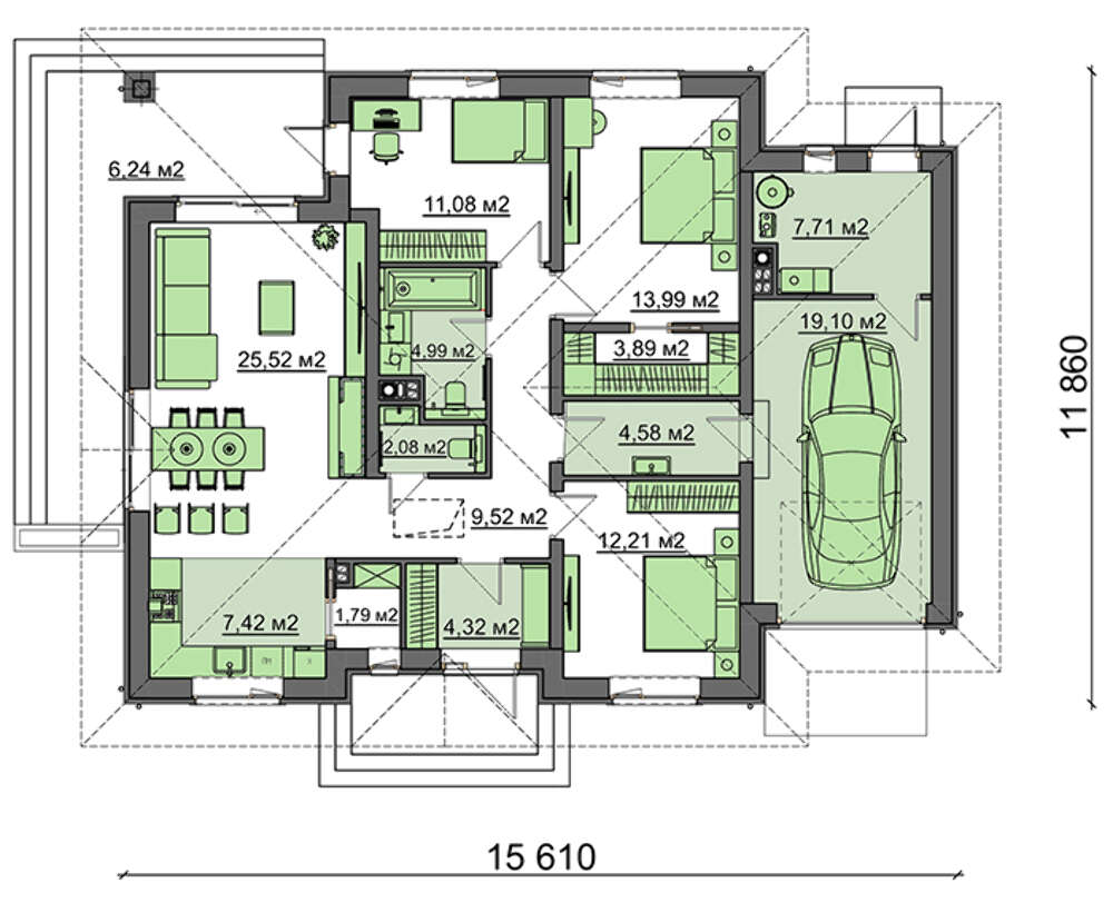 Проект содержит три раздела – Архитектурный, Конструктивный и Инженерный: водоснабжение, отопление, вентиляция, канализация, электроснабжение (приобретается за дополнительную плату) + Пояснительная записка.
