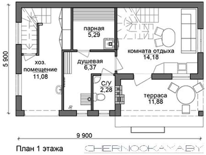 Проект содержит три раздела – Архитектурный, Конструктивный и Инженерный: водоснабжение, отопление, вентиляция, канализация, электроснабжение (приобретается за дополнительную плату) + Пояснительная записка.