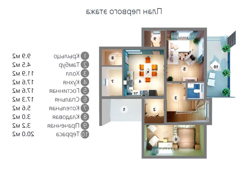 Внутренняя планировка  коттеджа отвечает всем правилам современной архитектуры. Дом разделен поэтажно на две зоны: дневную и ночную. В центре первого уровня расположена столовая-кухня, остальные помещения разместились вокруг. Площадь позволяет организовать место для приготовления пищи и обеденную зону. К кухне примыкает небольшая удобная кладовая 3,0 кв. м. В прачечной достаточно места для организации полноценной бытовой комнаты.