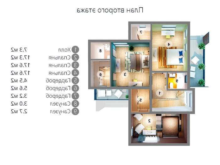 Второй этаж - территория отдыха членов семьи. Здесь запроектированы три спальни улучшенной комфортности с гардеробами, два санузла и небольшой холл.