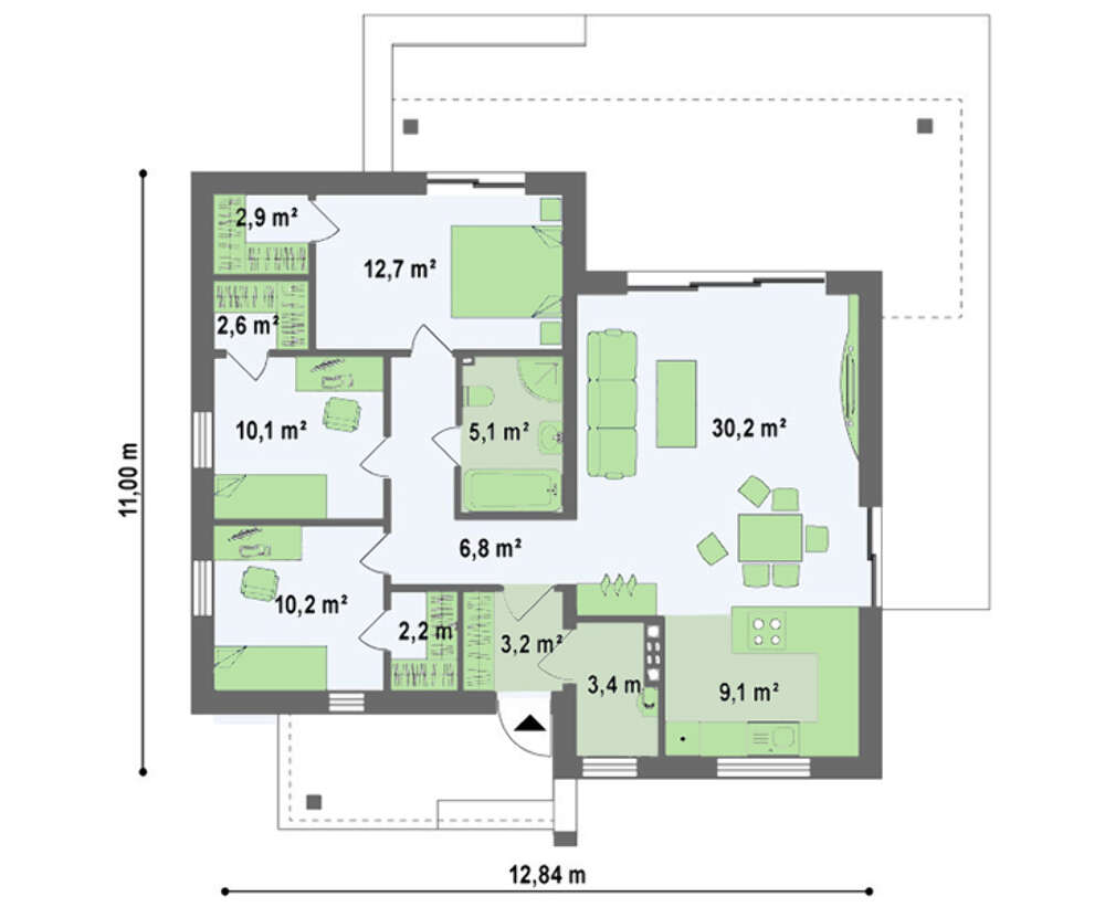 Проект содержит три раздела – Архитектурный, Конструктивный и Инженерный: водоснабжение, отопление, вентиляция, канализация, электроснабжение (приобретается за дополнительную плату) + Пояснительная записка.
