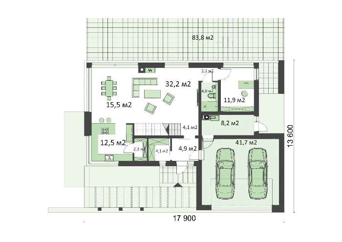 Проект содержит три раздела – Архитектурный, Конструктивный и Инженерный: водоснабжение, отопление, вентиляция, канализация, электроснабжение (приобретается за дополнительную плату) + Пояснительная записка.