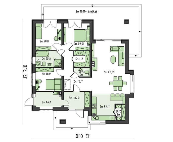 Проект содержит три раздела – АрхитектурныйКонструктивный и Инженерный: водоснабжение, отопление, вентиляция, канализация, электроснабжение (приобретается за дополнительную плату) + Пояснительная записка.
