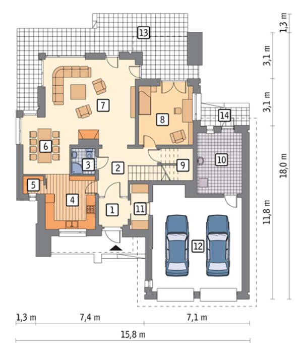 Проект содержит три раздела – Архитектурный, Конструктивный и Инженерный: водоснабжение, отопление, вентиляция, канализация, электроснабжение (приобретается за дополнительную плату) + Пояснительная записка.