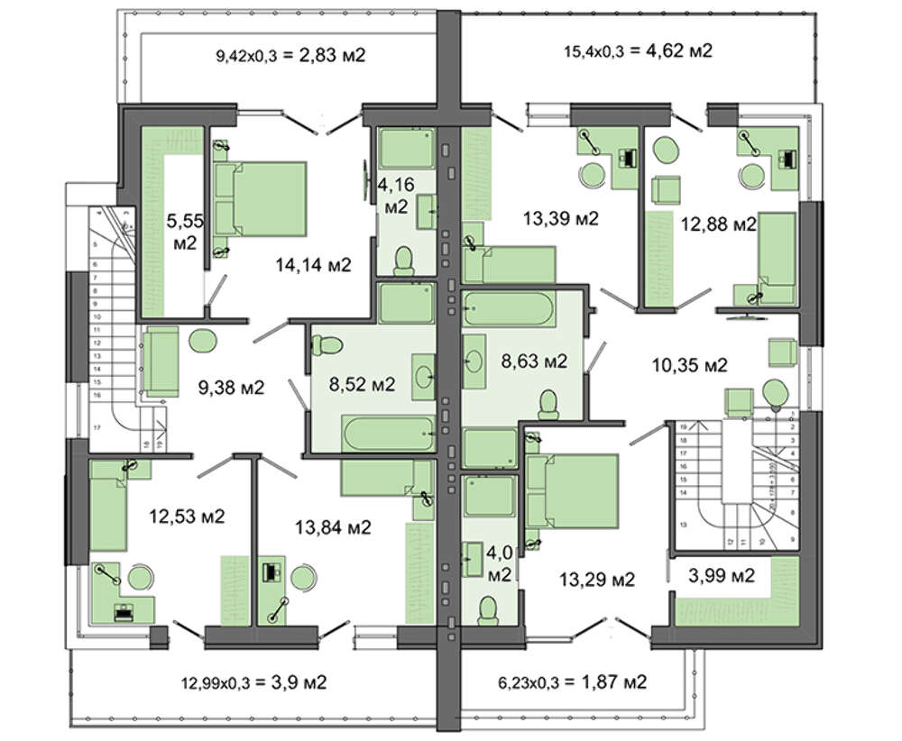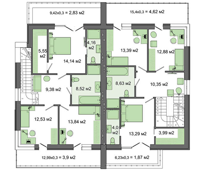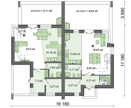 Проект содержит три раздела – Архитектурный, Конструктивный и Инженерный: водоснабжение, отопление, вентиляция, канализация, электроснабжение (приобретается за дополнительную плату) + Пояснительная записка.