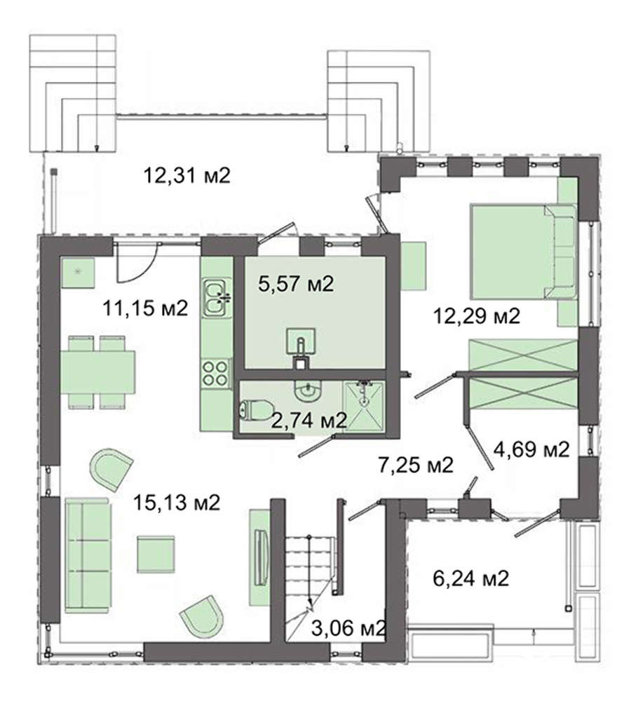 Первый этаж рационально поделен на просторные помещения. Топочная не связана с жилым пространством, ее площадь рекомендуется использовать под мастерскую или для хранения садового инструмента. Студия создана за счет единения кухни, столовой и гостиной. Она имеет собственный выход на веранду, где можно продолжить вечеринку, принимать солнечные ванные или организовать чаепитие.