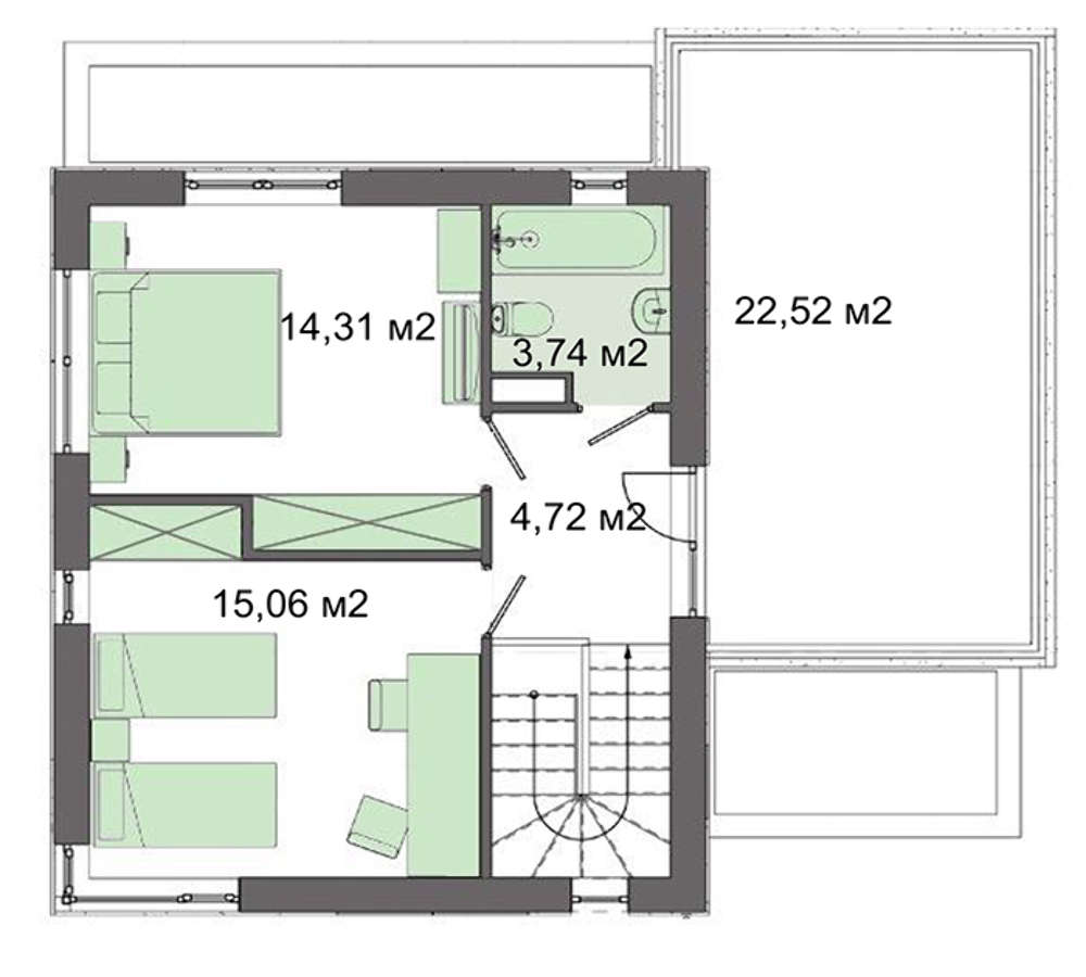 Спален три, одна из них находится на первом этаже. Ее владелец получает возможность покидать коттедж, минуя жилые комнаты, это очень важно для свободолюбивого человека. Оставшихся два личных помещения размещены на верхнем уровне, площадь каждого свыше 14 квадратов. Комнаты объединяет общий холл, с него имеется выход на просторную террасу. В проекте реализовано два санузла, они разнесены на разные этажи, больших вынесен на второй жилой уровень.