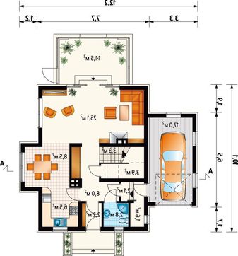 Все пространство первого этажа чисто условно поделено на зоны и предназначено для приема гостей и общего времяпровождения всех членов семьи. Большая часть помещения отделена для гостиной, выход из которой на террасу позволяет продолжить прием гостей в условиях роскошной естественной красоты природы. Установленные для отдыха кушетки, шезлонги и кресла помогут любоваться интересными цветочными клумбами или аккуратными посадками кустов вне зависимости от атмосферных условий.