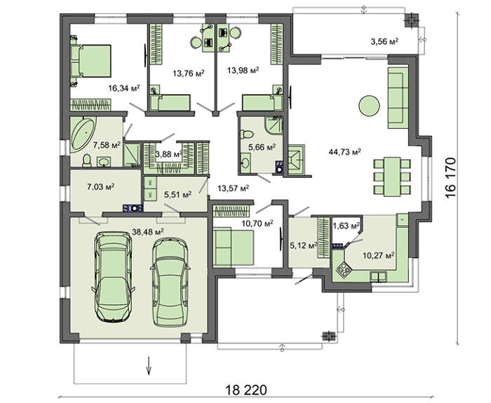 Проект содержит три раздела – Архитектурный, Конструктивный и Инженерный: водоснабжение, отопление, вентиляция, канализация, электроснабжение (приобретается за дополнительную плату) + Пояснительная записка.