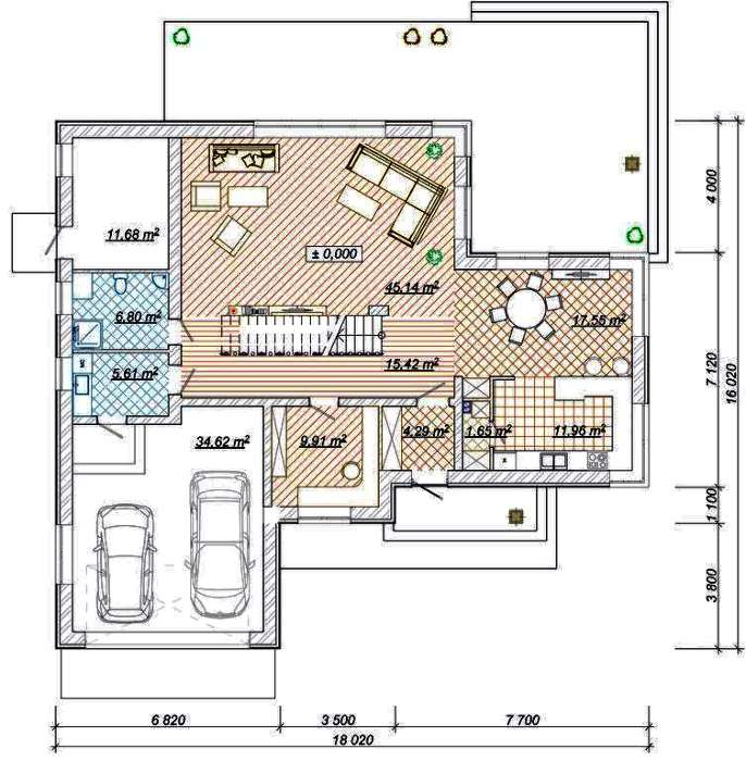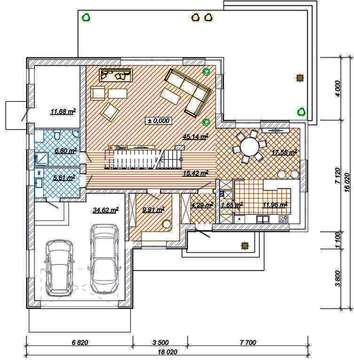 Встроенный гараж настолько просторный, что помещает два автомобиля одновременно. На прием приятелей и родственников рассчитано практически все пространство первого этажа. Здесь имеется достаточно места как для шумного детского утренника, так и молодежной вечеринки. При делении пространства не поощрялась экономия площади, все помещения имеют солидные габариты и позволяют выполнять заявленные работы с простором.