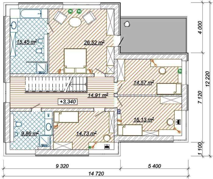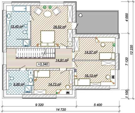 Особенность второго этажа в террасе большого размера которая позволяет бесконечно много времени проводить на свежем воздухе, любоваться природными ландшафтами, услаждать слух пением птиц и получать восторг от закатов или рассветов, это зависит от того, как дом повернут к солнцу.