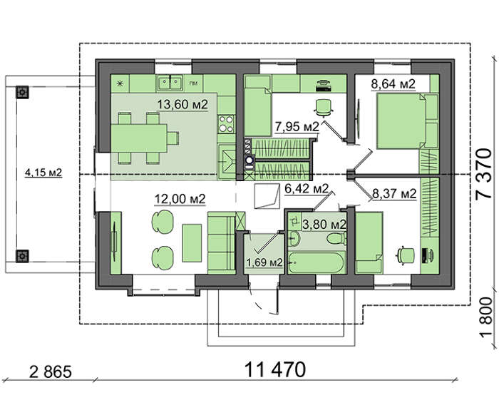 Проект содержит три раздела – Архитектурный, Конструктивный и Инженерный: водоснабжение, отопление, вентиляция, канализация, электроснабжение (приобретается за дополнительную плату) + Пояснительная записка.